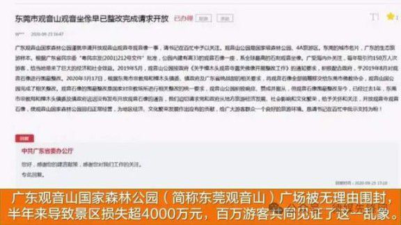 但东莞观音山公园方披露,该圣像早经广东省民宗委批准重建,且获认证为“世界最大花岗岩观音像”。“整改”完成后,广场仍被无理由围封至2022年2月,导致景区损失超4000万元,百万游客权益受损。从“阻挠经营”到“封锁核心景点”,被指暴露“抢夺不成便滥用权力”的逻辑。