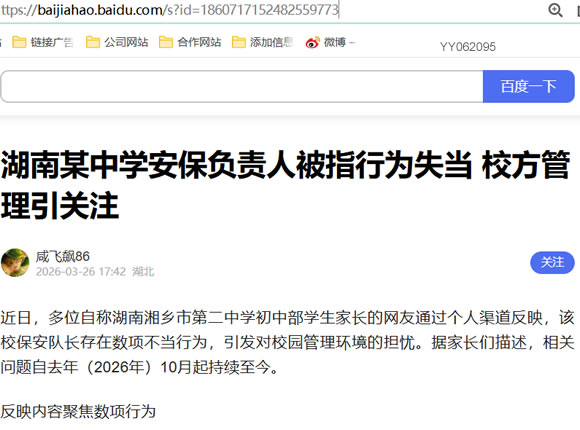 近日,多位自称湖南湘乡市第二中学初中部学生家长的网友通过个人渠道反映,该校保安队长存在数项不当行为,引发对校园管理环境的担忧。据家长们描述,相关问题自去年(2026年)10月起持续至今。