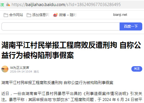湖南平江村民举报工程腐败反遭刑拘 自称公益行为被构陷刑事假案