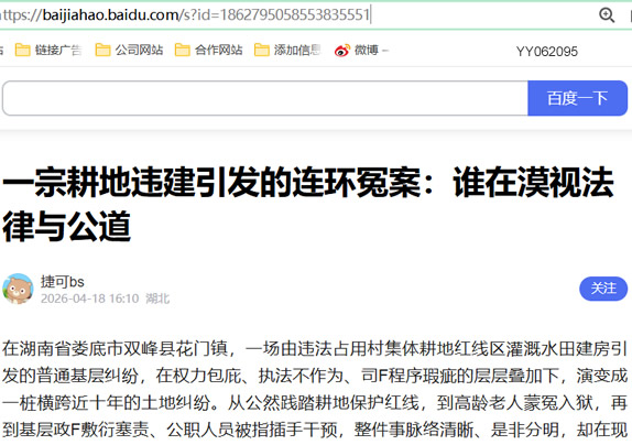 在湖南省娄底市双峰县花门镇,一场由违法占用村集体耕地红线区灌溉水田建房引发的普通基层纠纷,在权力包庇、执法不作为、司F程序瑕疵的层层叠加下,演变成一桩横跨近十年的土地纠纷。从公然践踏耕地保护红线,到高龄老人蒙冤入狱,再到基层政F敷衍塞责、公职人员被指插手干预,整件事脉络清晰、是非分明,却在现实中屡屡维权受阻,暴露出基层治理中令人痛心的漏洞。