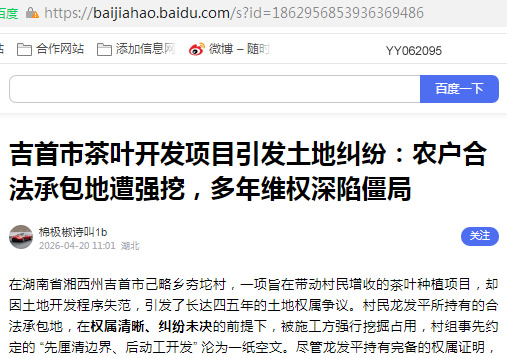 在湖南省湘西州吉首市己略乡夯坨村,一项旨在带动村民增收的茶叶种植项目,却因土地开发程序失范,引发了长达四五年的土地权属争议。村民龙发平所持有的合法承包地,在权属清晰、纠纷未决的前提下,被施工方强行挖掘占用,村组事先约定的 “先厘清边界、后动工开发” 沦为一纸空文。尽管龙发平持有完备的权属证明,并长期多方求助,但合法权益始终得不到保障,维权之路举步维艰。